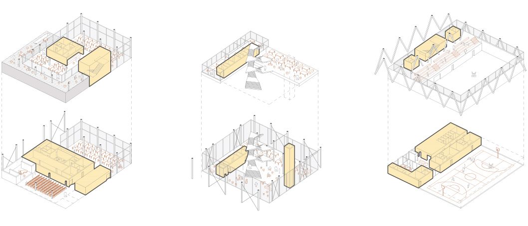 L’idea progettuale proposta considera la nuova scuola, non solo come spazio innovativo di apprendimento destinato ai suoi fruitori, ma come un vero e proprio luogo di comunità, pensato per offrire nuovi spazi destinati a favorire il confronto e l’integrazione; un luogo familiare e protettivo in cui ritrovarsi nelle diverse fasi dello sviluppo individuale e in diverse occasioni della vita collettiva. La proposta consiste nell’inserimento di tre volumi basamentali contenenti le funzioni condivise dalla Cittadella scolastica, permeabili e attraversabili dagli spazi vegetali e sportivi, al di sopra dei quali si colloca il volume contenente le aule e gli spazi laboratoriali. L’edificio si sviluppa su quattro livelli e si presenta come un organismo razionale al cui interno si articolano le varie attività. In contrasto con la compattezza dell’edificio, il progetto è stato sviluppato rimarcando una dualità formale, specchio della compresenza al suo interno di funzioni condivise con gli altri istituti della Cittadella dello Studente e di attività di esclusiva pertinenza della scuola.