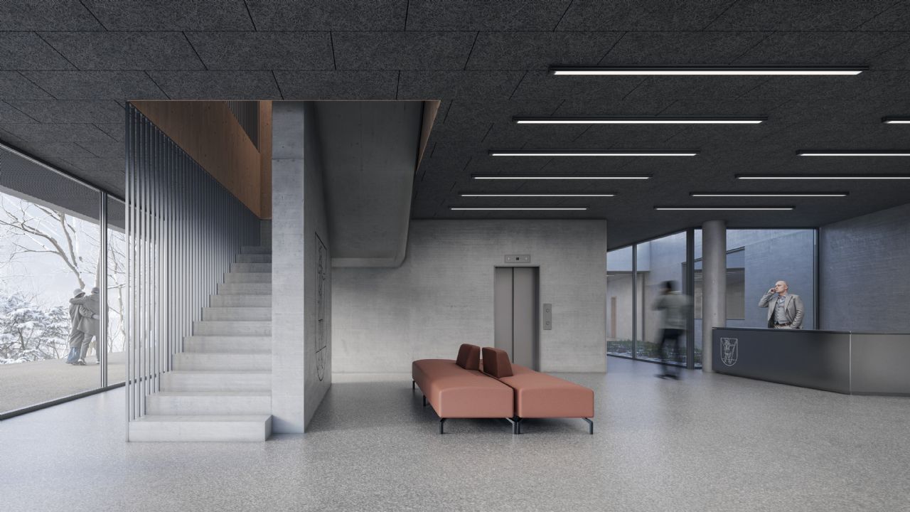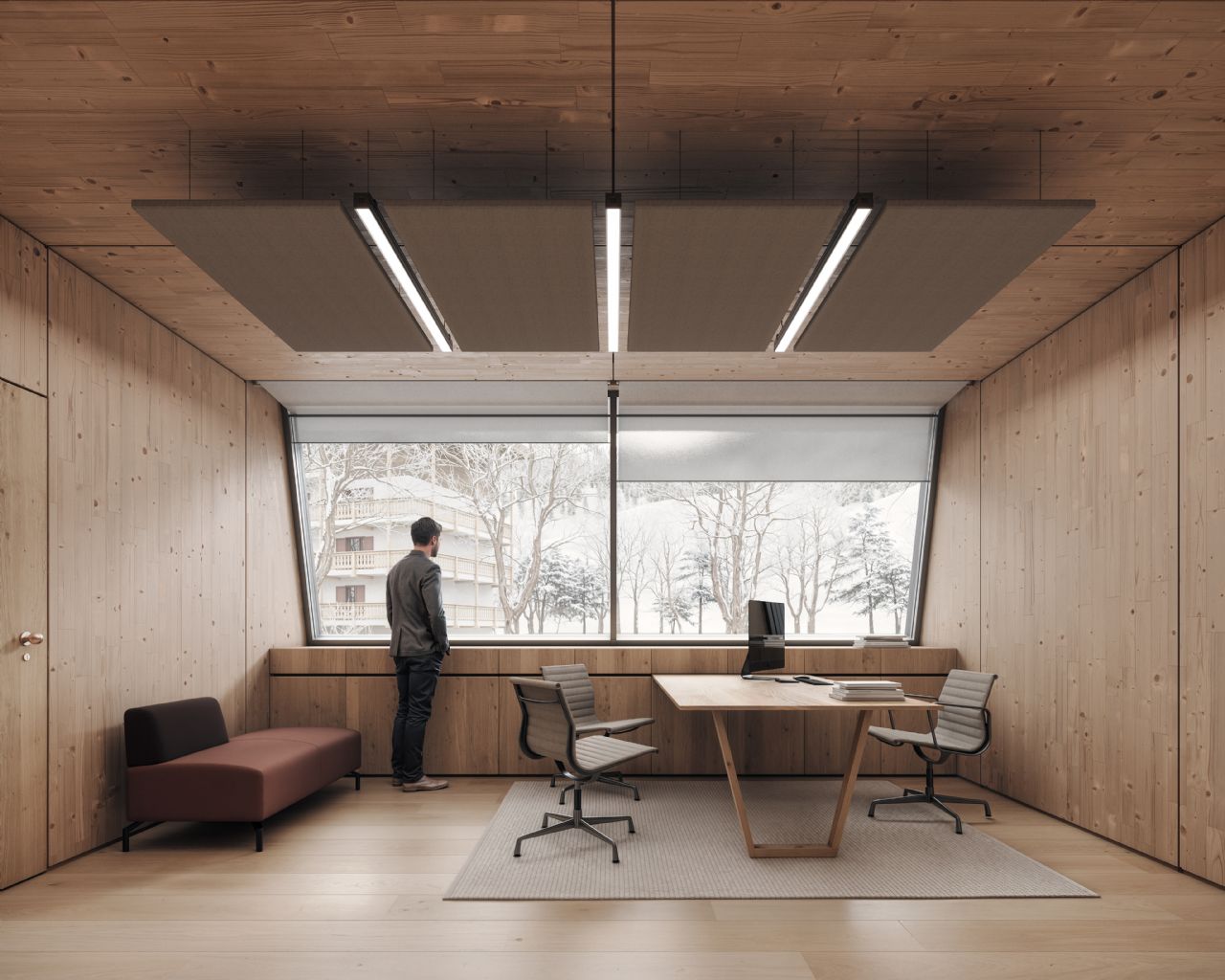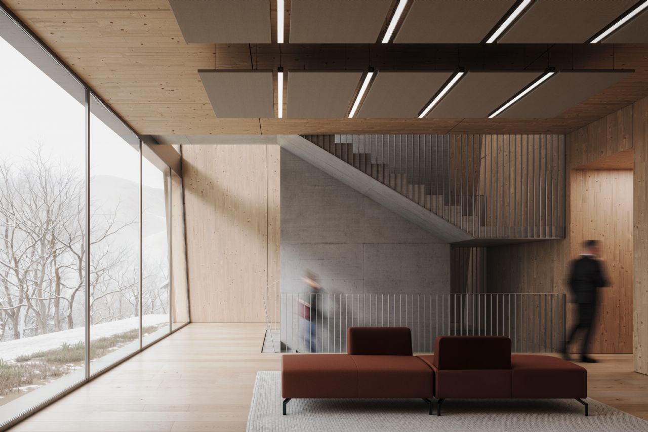 Il corpo basamentale diventa sia un elemento di mediazione del salto di quota a ovest sia l’elemento intorno al quale si connettono le due strade che perimetrano il lotto di progetto, generando così intorno a sé nuovi spazi per la comunità locale. Il corpo superiore, invece, diventa l’elemento visibile e riconoscibile, icona della nuova sede Comunale. Questo volume compatto, grazie alla sua forma ed alla sua posizione dialoga con il paesaggio circostante, entrando in relazione a grande scala con le vette delle Dolomiti e a scala più piccola con la Pieve di San Giovanni e le sue grandi falde del tetto. Le falde della copertura sono rivestite in scandole di legno e traforate da bucature longitudinali protette da sporti in metallo. La parte basamentale è in calcestruzzo liscio a facciavista realizzato con casseformi a pannelli modulari sia all’esterno che all’interno. Gli interni degli uffici sono puntualmente definiti da pannellature di legno fonoassorbenti con integrati corpi illuminanti e diffusori d’aria.