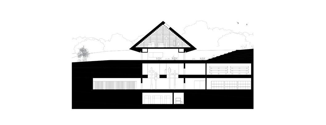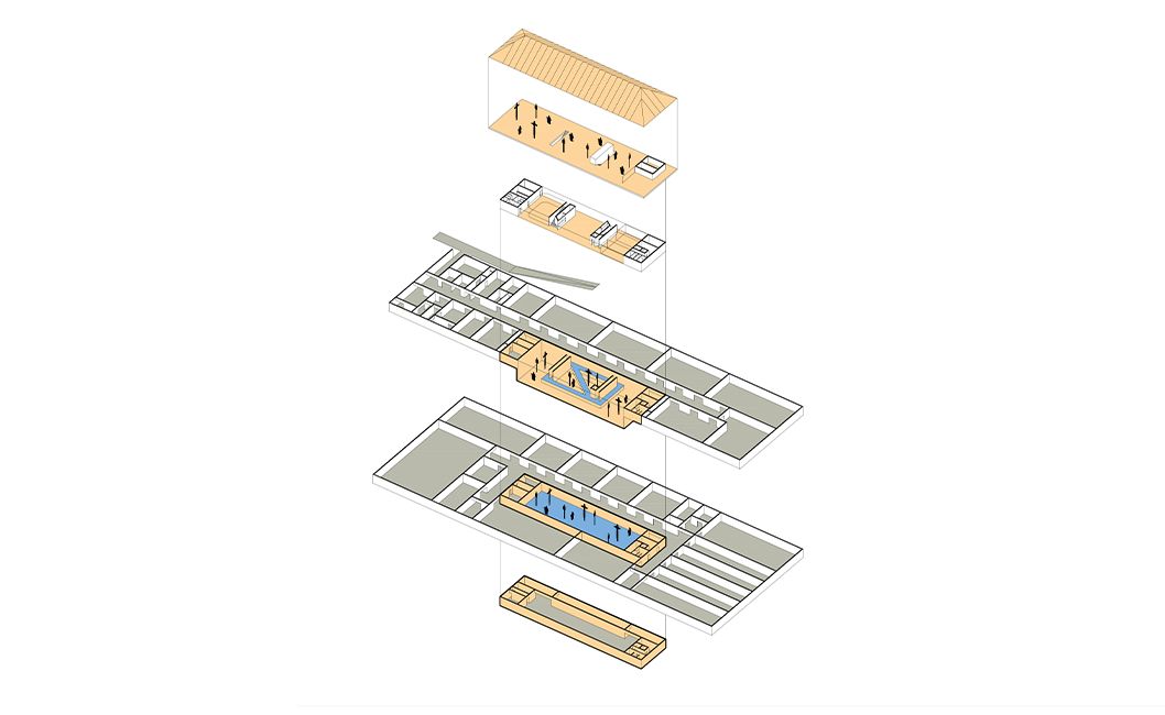 Il programma funzionale è organizzato in tre livelli concettuali e spaziali: in alto, la copertura ospita una grande sala per esposizioni temporanee; al centro, una piazza coperta accoglie il centro di competenza, gli spazi di lavoro e la caffetteria; sotto terra, tre livelli sono dedicati agli archivi. Questa stratificazione rispecchia i tre principi fondanti del progetto: mostrare, formare e conservare.