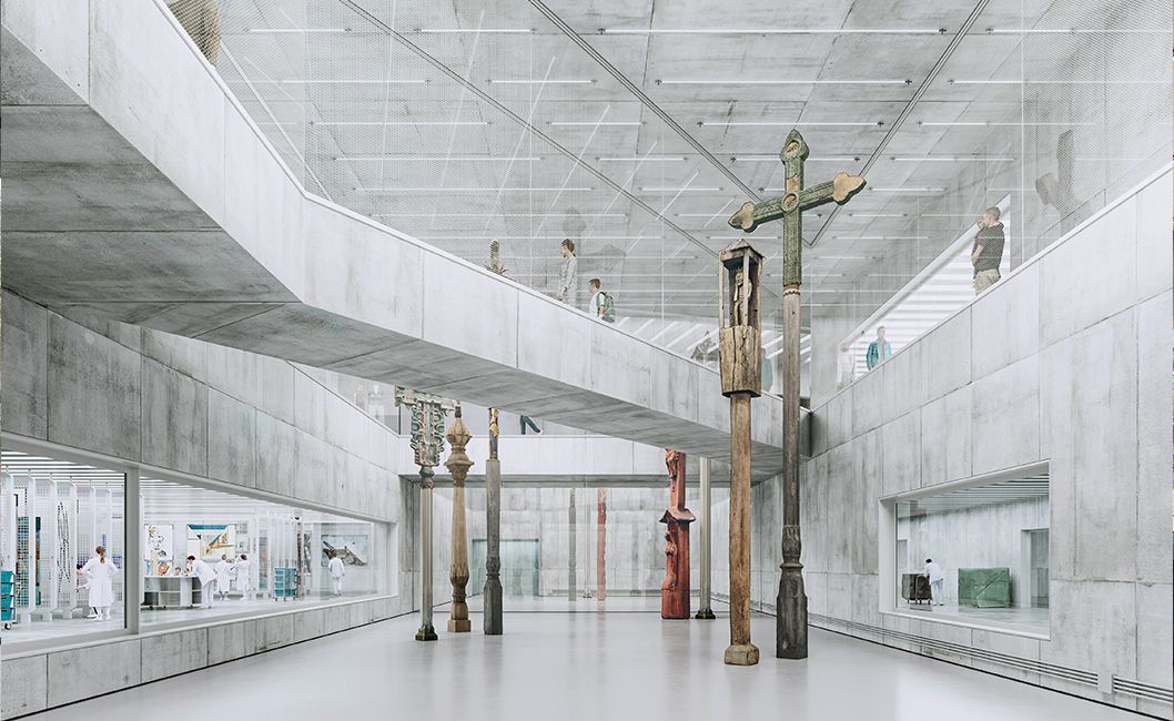 Il museo–archivio si configura come un’architettura ibrida, in cui la distinzione tra spazi tecnici e spazi pubblici viene superata. I visitatori possono accedere ai “dietro le quinte” del museo, osservando i processi di conservazione, restauro e gestione delle opere, trasformando l’archivio stesso in un’esperienza culturale e conoscitiva. Un elemento strutturale e distributivo centrale attraversa tutti i livelli dell’edificio, ordinando la complessità funzionale e mettendo in relazione ambienti profondamente diversi tra loro, dall’assoluta chiusura delle aree di deposito alla massima apertura degli spazi pubblici.