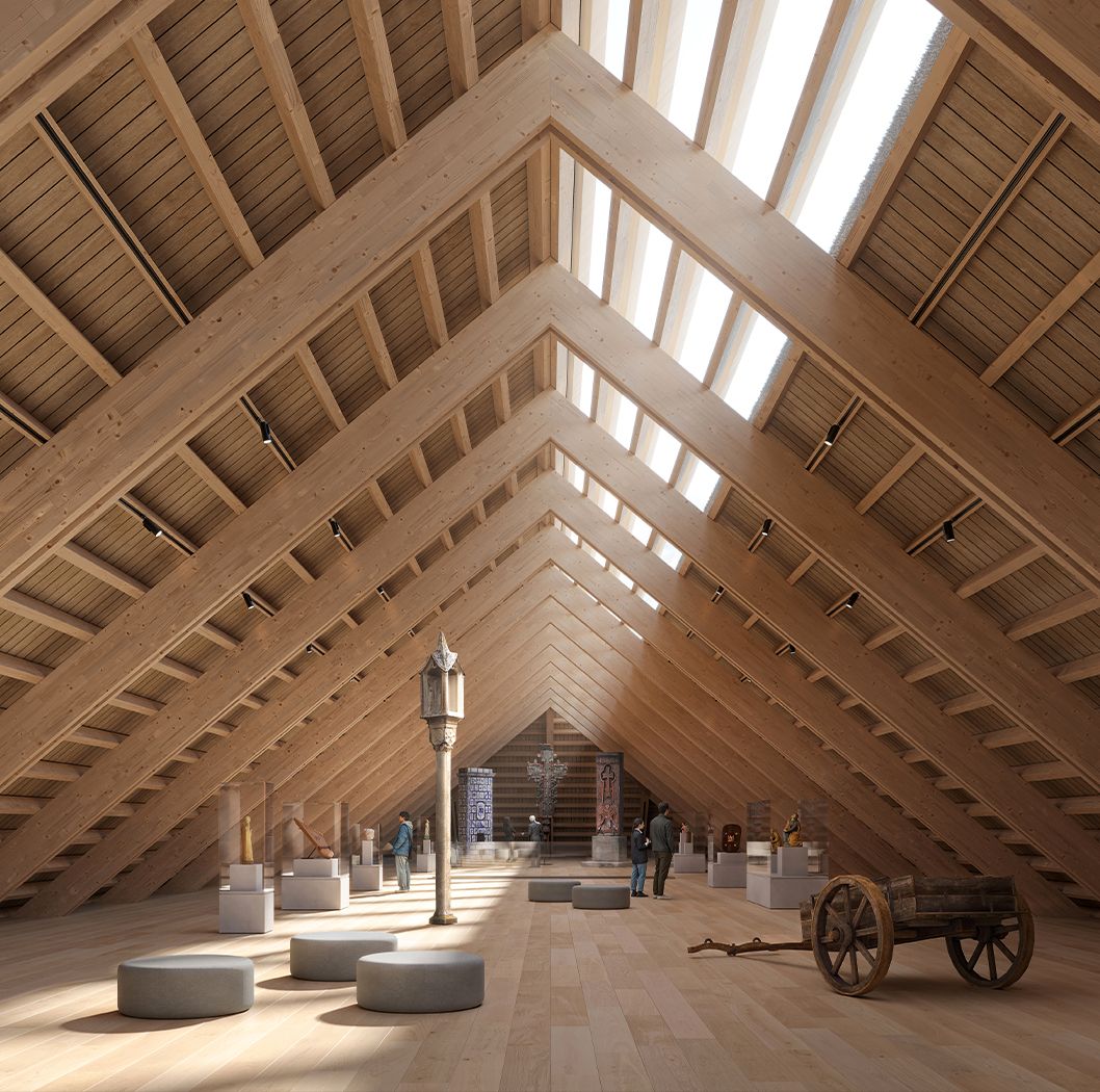 La concezione architettonica trae ispirazione dal contesto del Museo Etnografico di Rumšiškes e dalla tipologia del klojimas, il granaio tradizionale lituano: un edificio agricolo monumentale, isolato all’interno della cascina e destinato alla conservazione dei beni più preziosi. Questa analogia tra il klojimas come deposito del raccolto e l’archivio come custode della memoria ha guidato l’intero progetto, sia nella sua forma che nel suo significato simbolico.